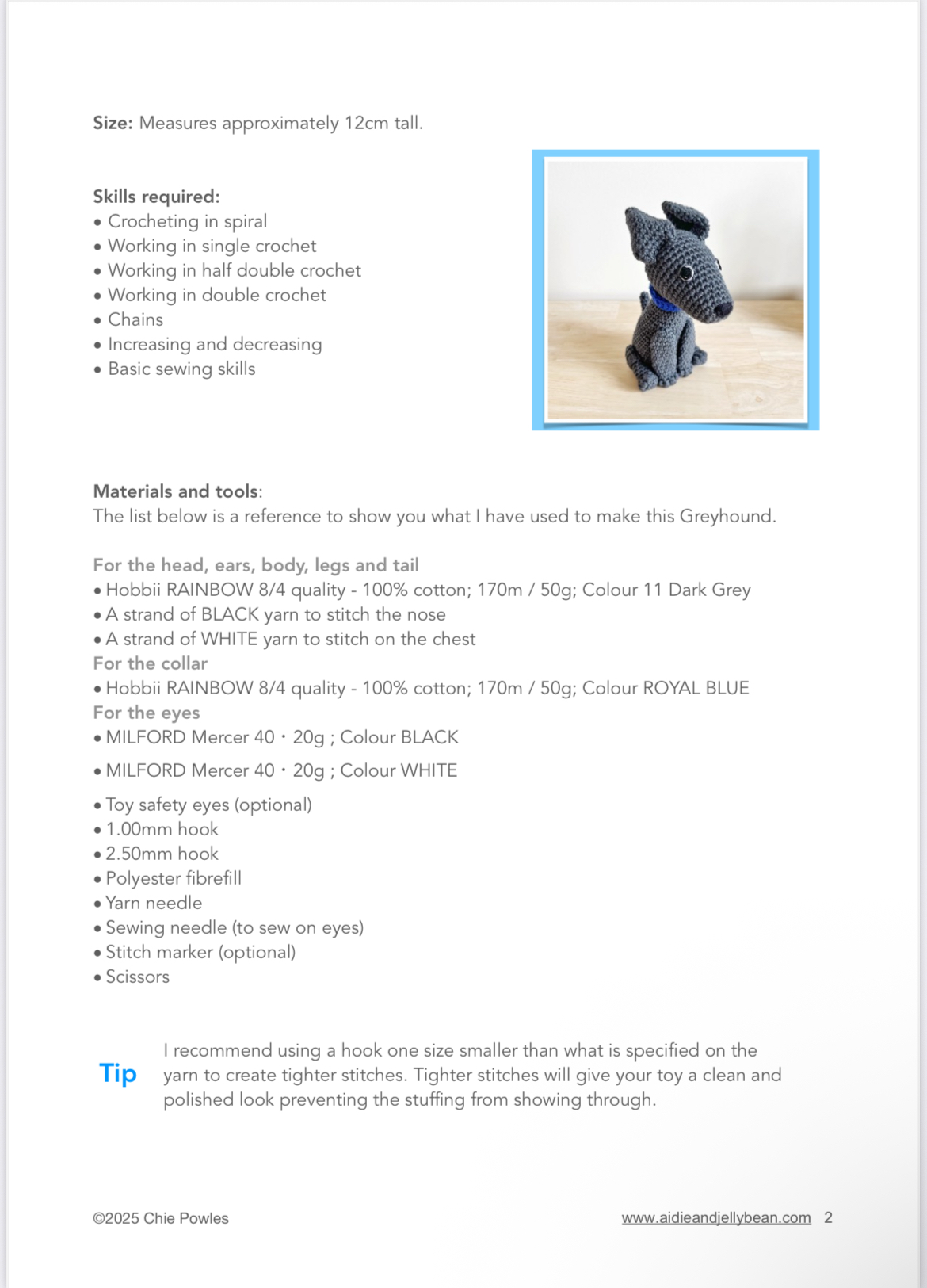 This is a PATTERN for making an amigurumi Greyhound and NOT the finished product. The PDF is available in English (US crochet terminology is used).
